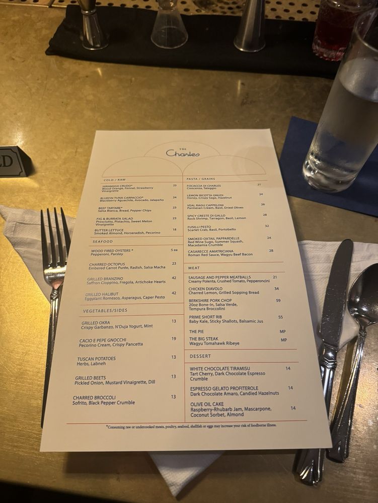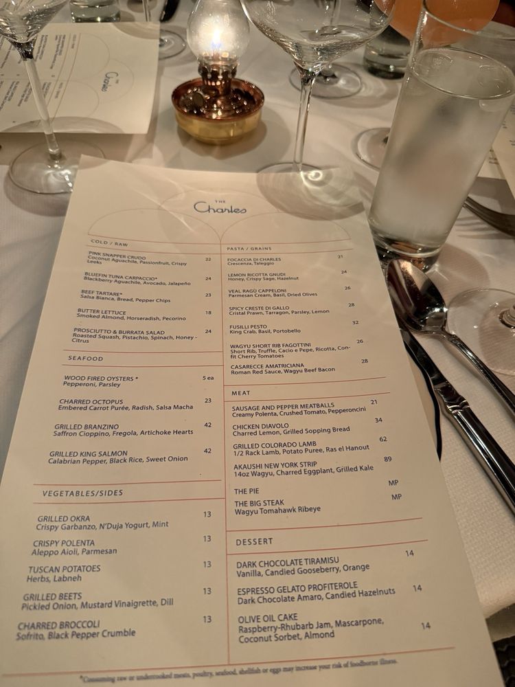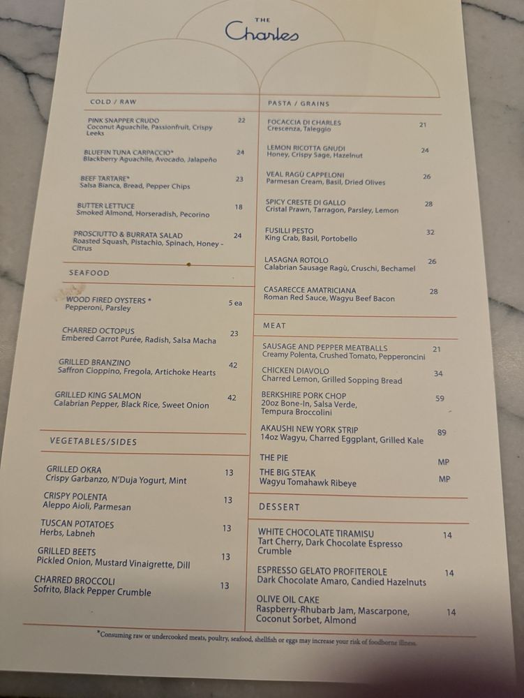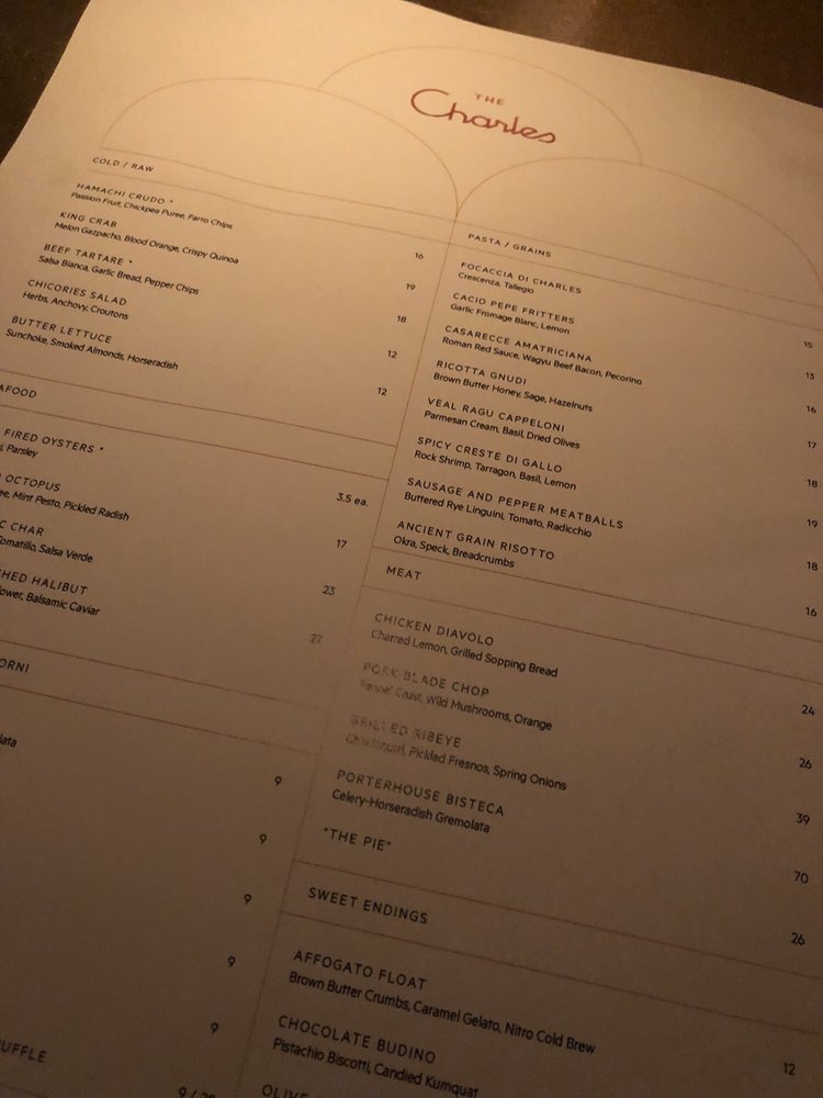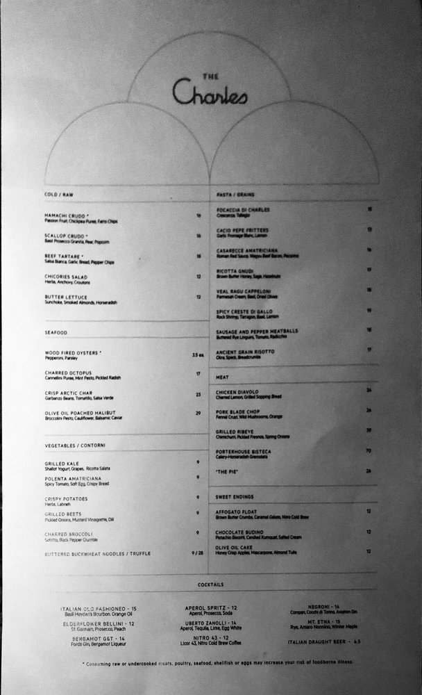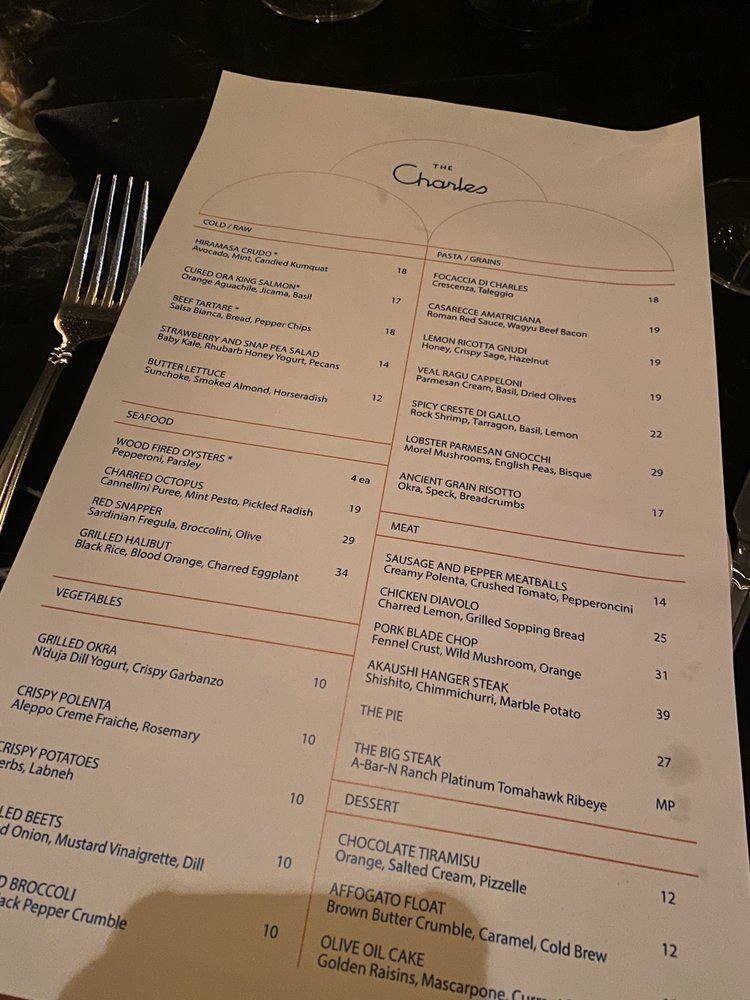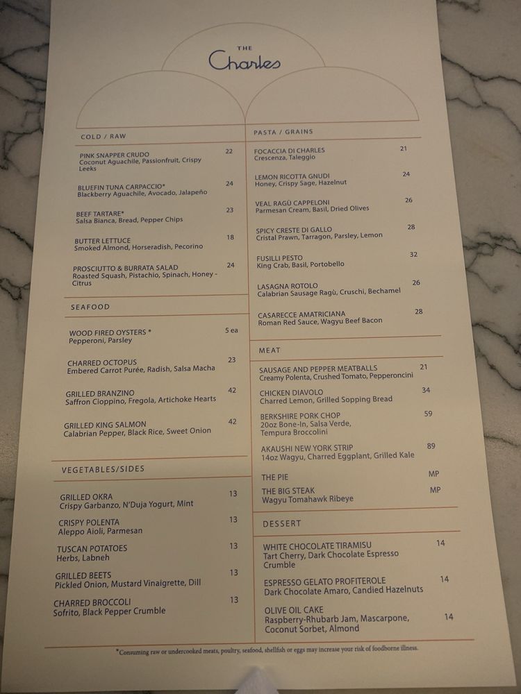 The Charles is an upscale Italian restaurant located in Dallas, Texas, offering a wide range of amenities and options. With a focus on seafood, their menu includes unique dishes like Charred Octopus Canneuini with mint pesto and pickled radish, as well as Wood Fired Oysters with pepperoni and parsley. Vegetarian options are plentiful, with dishes like Grilled Kale with shallot yogurt and Polenta Amatriciana with spicy tomato and a soft egg. Their Cold and Raw section features delicacies such as Hamachi Crudo with passion fruit and Scallop Crudo with basil prosecco granita. The Charles provides a luxurious dining experience with impeccable service and a diverse menu that caters to all preferences.